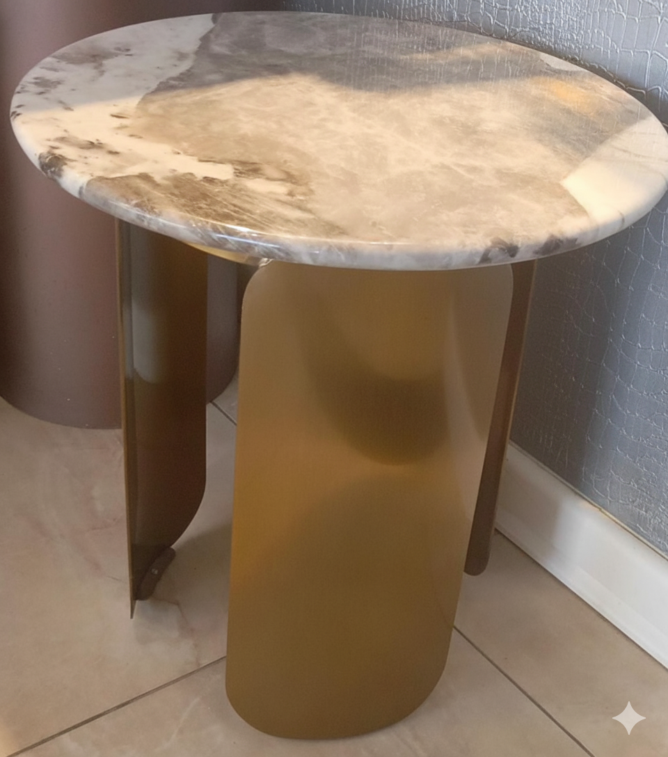 A modern side table with a luxurious and artistic design. It features a round top made of beautiful white and gray veined marble. The base is composed of two curved, metallic gold-toned panels that interlock, giving the table a sculptural and elegant appearance.