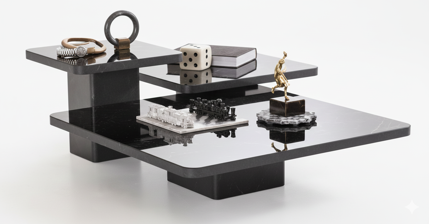 A modern, multi-tiered coffee table. The table features two rectangular, high-gloss black platforms at different levels, creating a sleek and dynamic silhouette. The minimalist design and dark finish make it a sophisticated and functional piece for any contemporary living space.