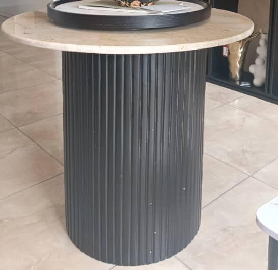 A modern side or pedestal table. It features a round, light-colored stone or marble top and a cylindrical, fluted black base. The textured base and smooth top create a stylish contrast, giving the table a sophisticated and contemporary look