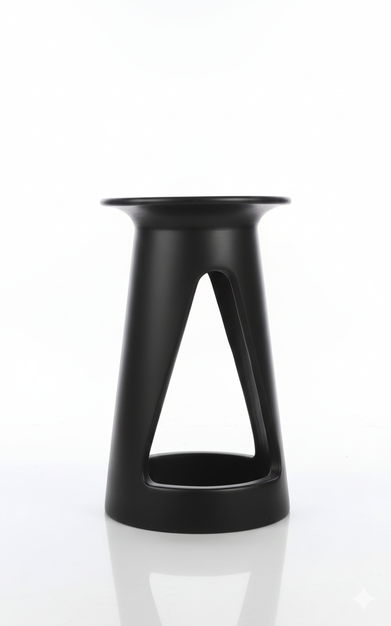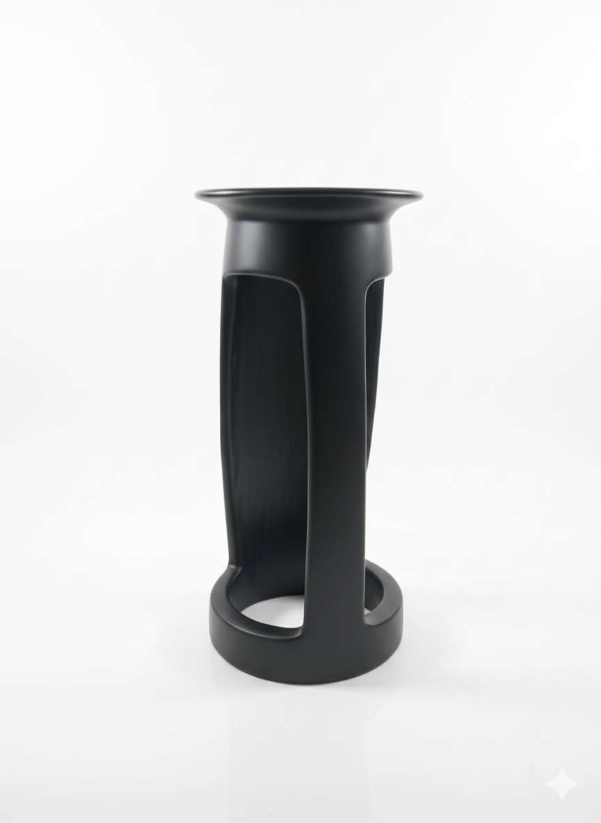 A modern and sculptural side table or pedestal. It has a unique, hourglass-like silhouette with a flat top and base. The piece is finished in a smooth, matte black, and its open, curved design creates a contemporary and artistic accent for any room